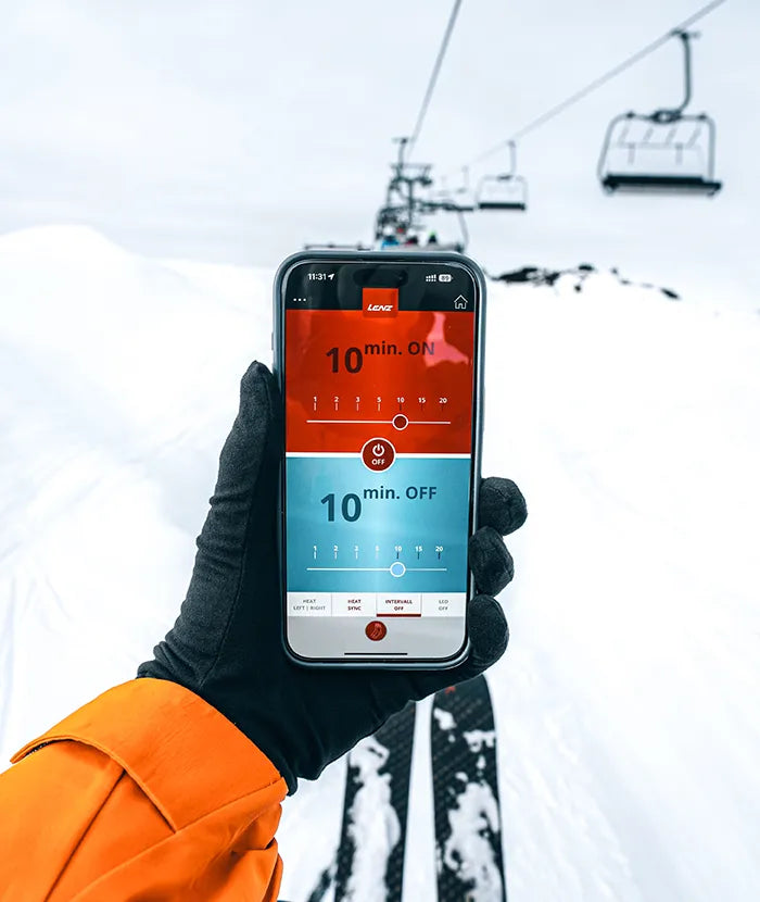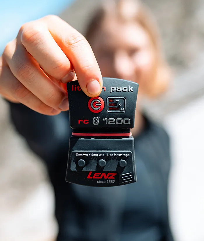 鋰電池組 rcB 1200 可用於驅動 Lenz 加熱襪、加熱背心、加熱褲及加熱手套。電池可透過按扣輕鬆固定。小巧的鋰電池組能在身體特別容易受寒的部位提供暖意。加熱強度可直接在鋰電池組上調節,或透過免費的智慧手機 App 控制。